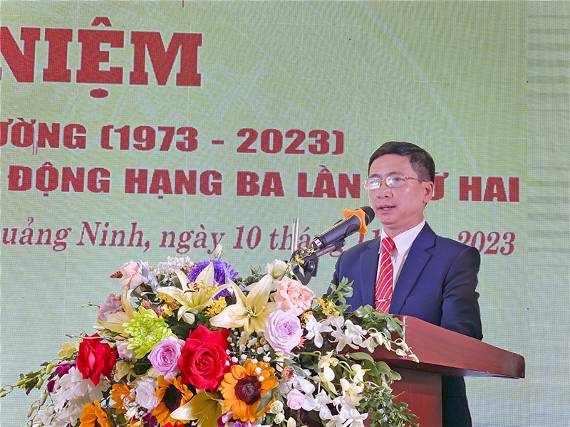 Đồng chí Cao Tường Huy, Ủy viên Ban thường vụ Tỉnh ủy, Quyền Chủ tịch UBND tỉnh Quảng Ninh tặng hoa chúc mừng Nhà trường.