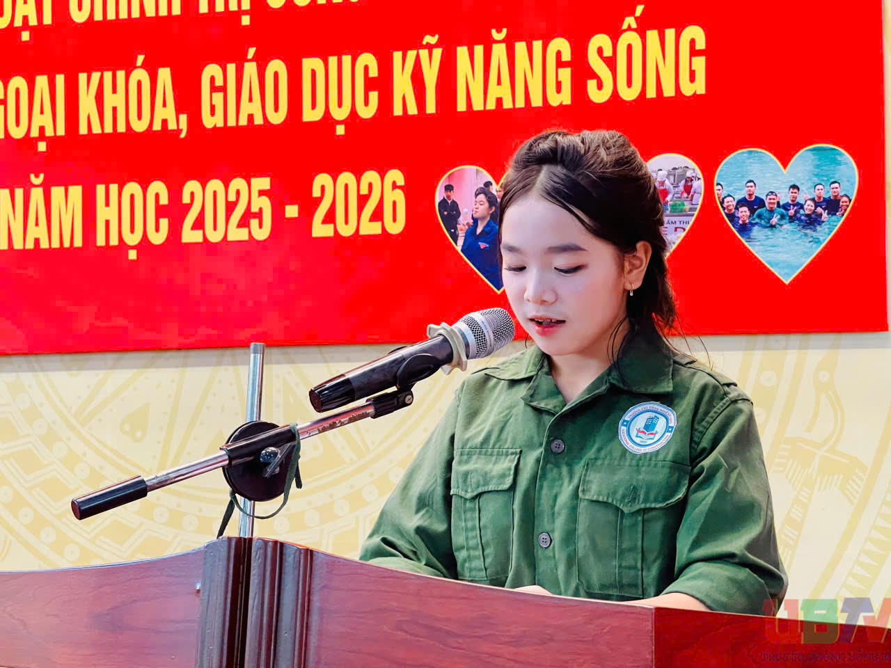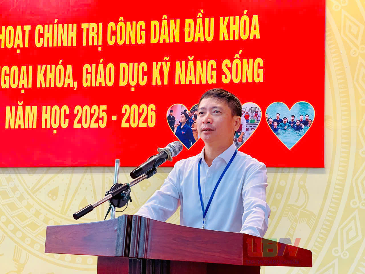 Đại diện nhà trường báo cáo kết quả tuần sinh hoạt chính trị công dân đầu khóa, hoạt động ngoại khóa, giáo dục kỹ năng sống năm học 2025-2026.