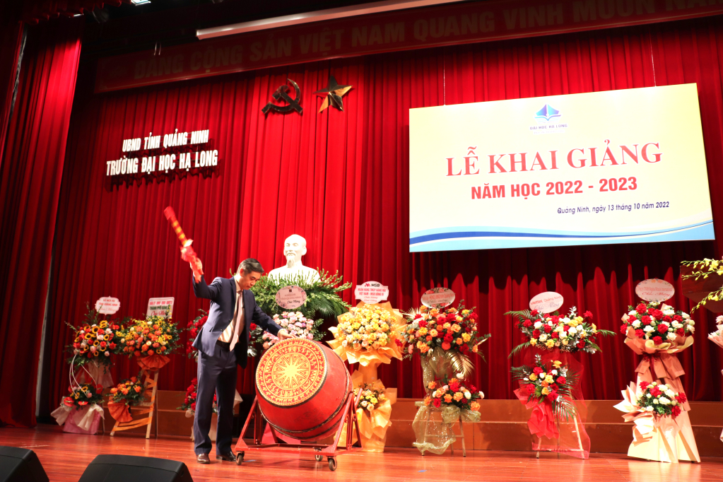Ông Trần Trung Vỹ, Phó Hiệu trưởng Trường Đại học Hạ Long đánh trống khai giảng.