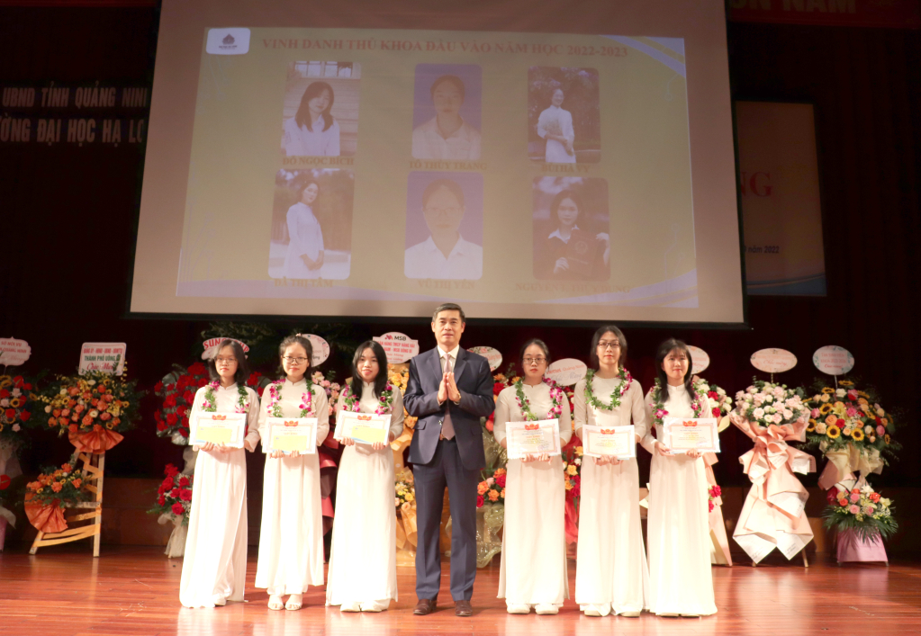 Nhân dịp này, Trường Đại học Hạ Long đã vinh danh 6 thủ khoa đầu vào năm học 2022-2023; các doanh nghiệp hợp tác với nhà trường dành tặng các suất học bổng cho các sinh viên có hoàn cảnh khó khăn, đạt thành tích cao trong học tập và rèn luyện.
