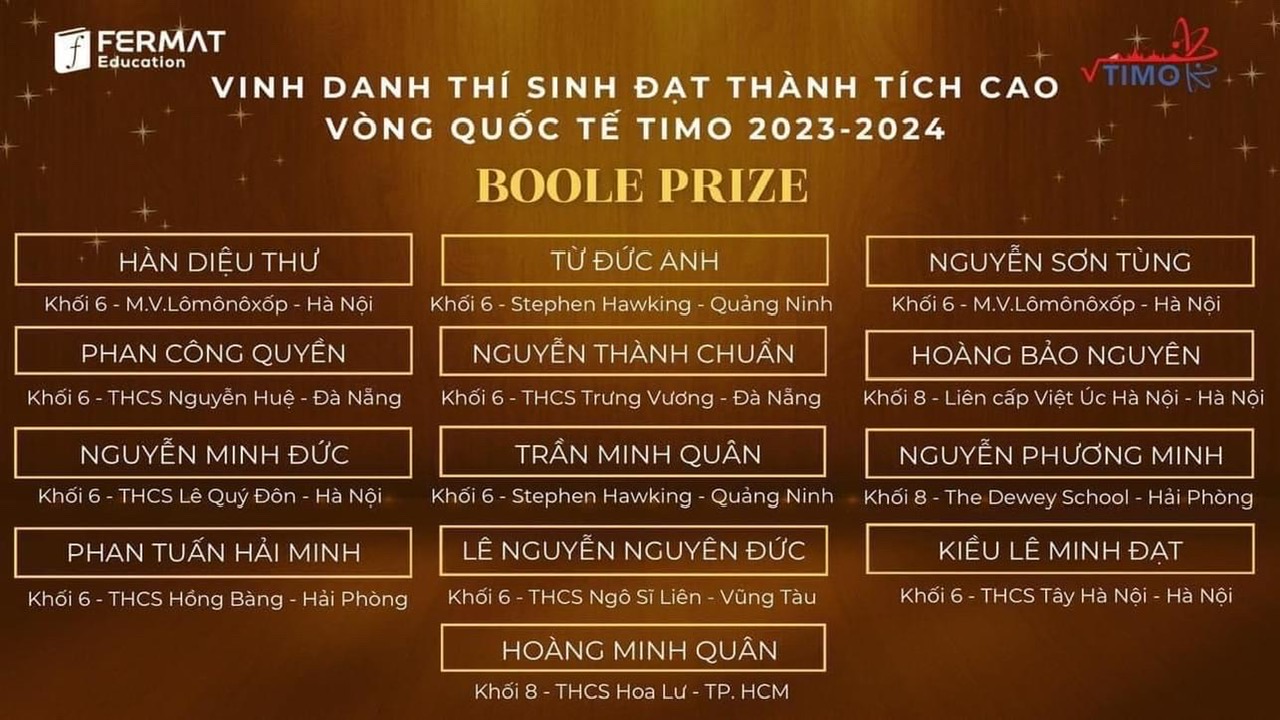 Ngoài ra, em Từ Đức Anh, lớp SH 6.2 và Trần Minh Quân, lớp SH 6.2 đã vinh dự lọt top 25 giải Boole Prize, Thí sinh đạt điểm tuyệt đối chủ đề Tư duy Logic.