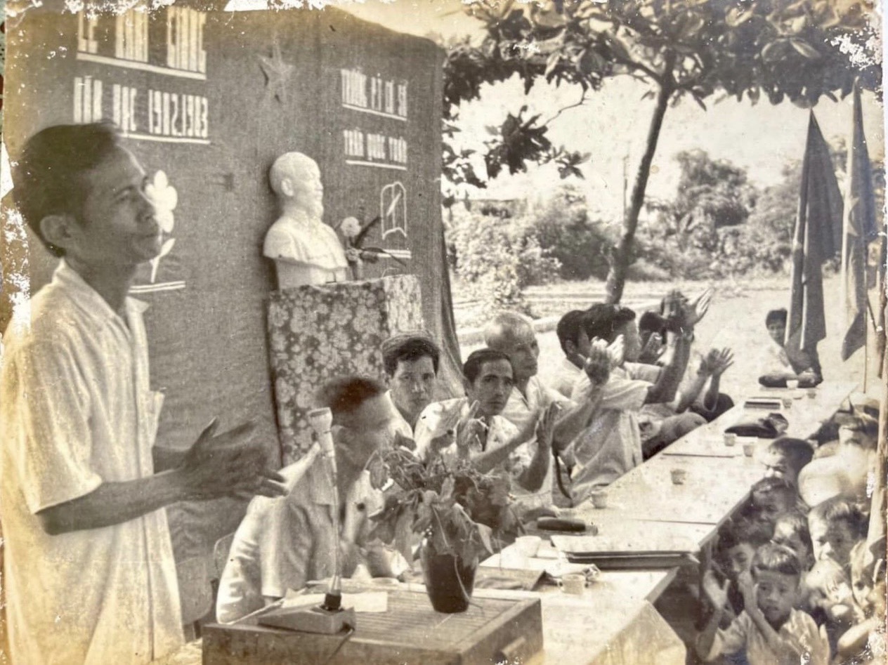 Thày giáo Phạm Xuân Tỷ, nguyên Phó Chủ tịch thị xã Uông Bí phát biểu chúc mừng khai giảng năm học 1982-1983.