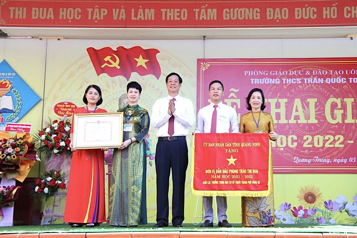 Đồng chí Phạm Tuấn Đạt, Phó Bí thư Thành ủy, Chủ tịch UBND thành phố trao Cờ thi đua dẫn đầu cấp học THCS và công nhận Tập thể LĐXS của UBND tỉnh cho Trường THCS Trần Quốc Toản.