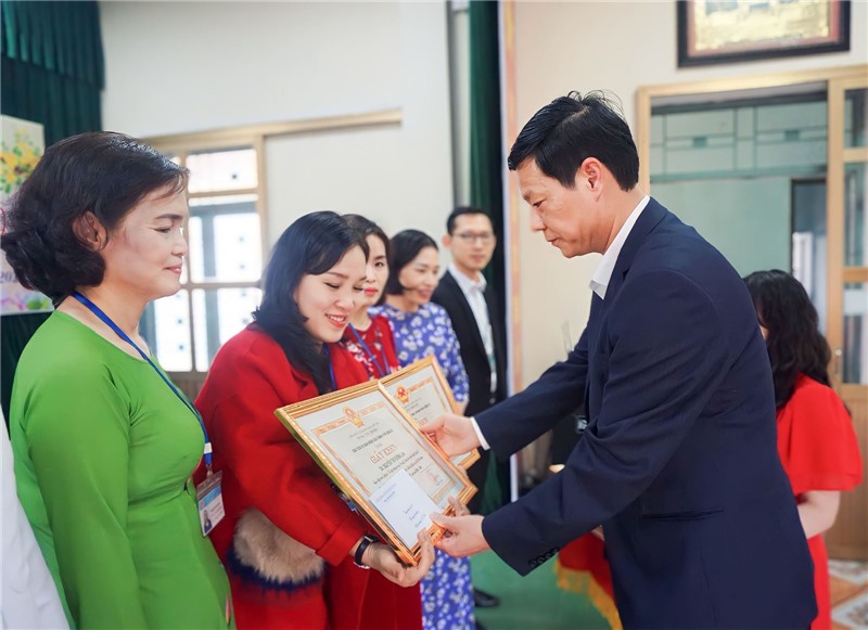 Đồng chí Chủ tịch UBND thành phố tặng giấy khen cho 11 giáo viên có thành tích xuất sắc.
