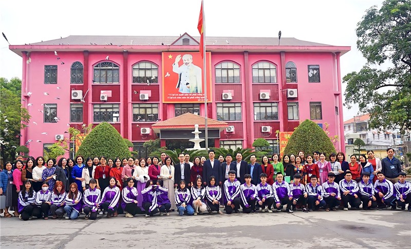 Đồng chí Phó Bí thư Thành ủy, Chủ tịch UBND thành phố Phạm Tuấn Đạt chụp ảnh lưu niệm cùng tập thể Ban giám hiệu, giáo viên, học sinh Trường THPT Uông Bí.