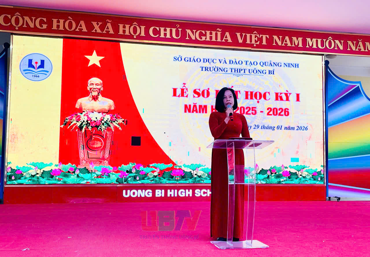 Phát biểu tại lễ sơ kết, cô Vũ Thị Thu Huyền, Bí thư Đảng bộ, Hiệu trưởng Trường THPT Uông Bí ghi nhận biểu dương những thành tích nổi bật mà thầy và trò nhà trường đã đạt được trong năm học 2025-2026. Trên cơ sở kết quả đạt được, học kỳ II năm học 2025-2026, Trường THPT Uông Bí xác định tiếp tục mục tiêu nâng cao chất lượng dạy học đại trà, giữ vững và phát huy thành tích học sinh giỏi; tiếp tục quyết liệt thực hiện NQ 71-NQ/TW của Bộ Chính trị về đột phá phát triển giáo dục và đào tạo, Nghị quyết 57-NQ/TW về đột phá phát triển khoa học, công nghệ, đổi mới sáng tạo và chuyển đổi số quốc gia trong hoạt động giáo dục. Trong học kỳ 2 Nhà trường sẽ đưa vào vận hành phòng học STEM - tiền đề quan trọng để tạo đột phá trong giáo dục STEM và ứng dụng AI trong giảng dạy. Nhà trường cũng sẽ triển khai đề án đưa tiếng Anh trở thành ngôn ngữ thứ 2 với những giải pháp cụ thể như: mỗi tuần 1 tiết học các môn văn hoá được giảng dạy hoàn toàn tiếng Anh, ngày nói tiếng Anh trong nhà trường. Trường THPT Uông Bí tiếp tục đẩy mạnh giáo dục hướng nghiệp, chuẩn bị tốt cho học sinh lớp 12 tham gia kỳ thi tốt nghiệp THPT.