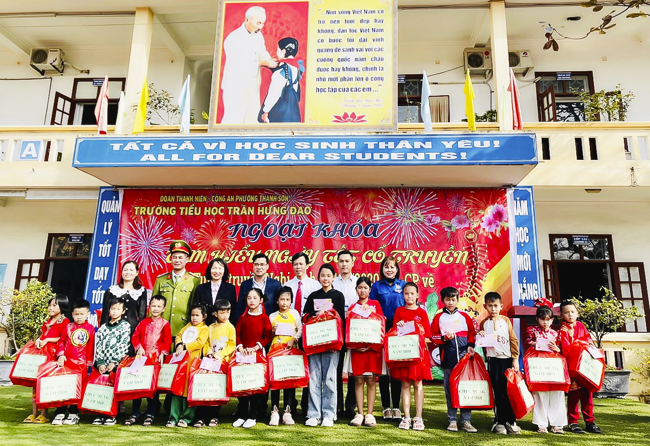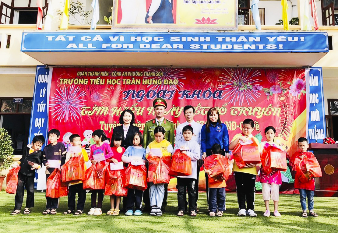 Trong không khí rộn ràng chào đón năm mới 2023, vừa qua, Đoàn thanh niên và Công an phường Thanh Sơn, phối hợp với Trường Tiểu học Trần Hưng Đạo đã tổ chức chương trình ngoại khoá: “Tìm hiểu ngày Tết cổ truyền”; tuyên truyền Nghị định số 137/2020/NĐ-CP ngày 27/11/2020 của Chính Phủ về quản lý, sử dụng pháo.