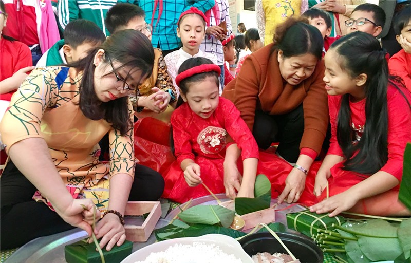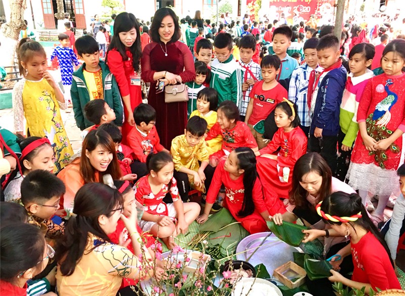 Trong chương trình, cùng với thưởng thức các tiết mục văn nghệ sôi động, vui tươi, tràn ngập sắc xuân, các em học sinh, thầy cô giáo, phụ huynh đã cùng tham gia thi gói những chiếc bánh chưng, bày mâm ngũ quả đẹp mắt, mang đậm phong vị ngày Tết.