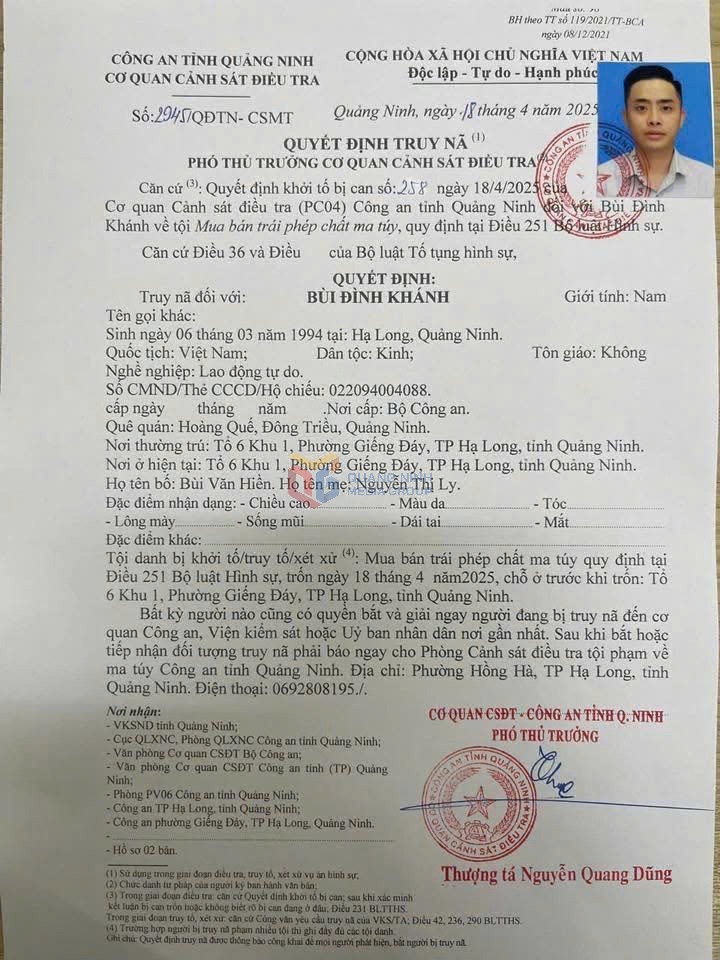 Đối tượng Bùi Đình Khánh bị truy nã về tội mua bán trái phép chất ma túy, quy định tại điều 251, Bộ Luật hình sự, trốn ngày 18/4/2025.