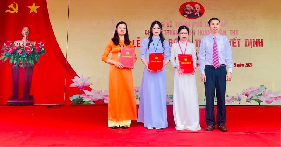 Vũ Thị Thủy Hương và Đặng Thu Thảo (giữa) trong Lễ công bố quyết định kết nạp Đảng của Chi bộ Trường THPT Hoàng Văn Thụ. Ảnh: CTV