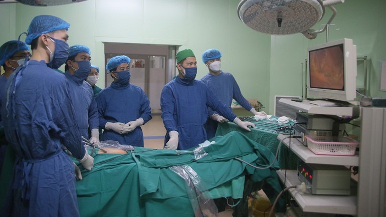 Các y, bác sĩ Bệnh viện đa khoa Ba Vì, Hà Nội, mổ nội soi cho người bệnh. (Ảnh: Nhandan.vn)