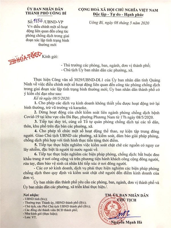 Ngày 8/5, UBND thành phố Uông Bí ban hành công văn số 1156/UBND-VP về việc điều chỉnh một số hoạt động liên quan đến công tác phòng chống dịch trong giai đoạn xác lập tình trạng bình thường mới.