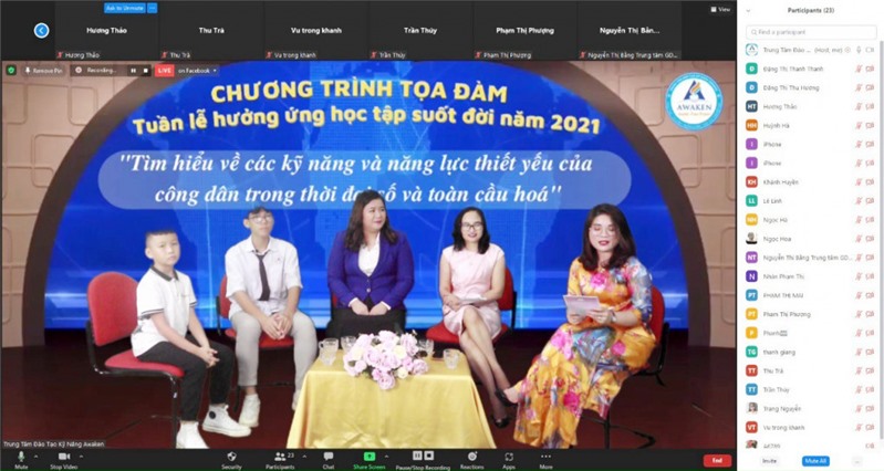 Tương tự, trong khuôn khổ Tuần lễ hưởng ứng học tập suốt đời, Hệ thống Trung tâm đào tạo kỹ năng Awaken (TP Hạ Long) cũng đã tổ chức thành công chương trình tọa đàm theo hình thức trực tuyến để tìm hiểu về các kỹ năng và năng lực thiết yếu của công dân trong thời đại số và toàn cầu hóa.