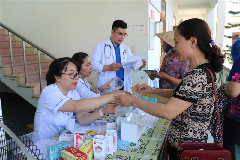 Đoàn viên, thanh niên Bệnh viện phát thuốc miễn phí cho người dân trong chương trình khám bệnh nhân đạo.