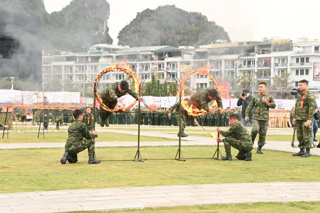 Cán bộ, đoàn viên, thanh niên LLVT tỉnh tham gia biểu diễn võ thuật tại Lễ ra quân huấn luyện năm 2024.