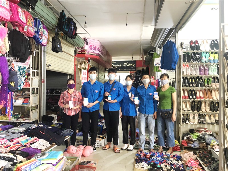 Lực lượng đoàn viên thanh niên thành phố Uông Bí hỗ trợ các tiểu thương cài đặt Bluezone.