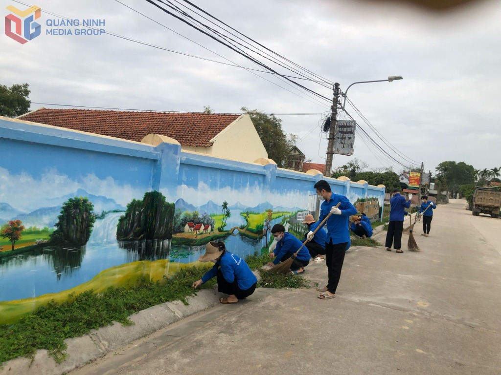Đoàn viên thanh niên tham gia vẽ tranh tường tuyến phố Trần Hưng Đạo (phường Yên Giang, TX Quảng Yên). Ảnh: Hoài Minh