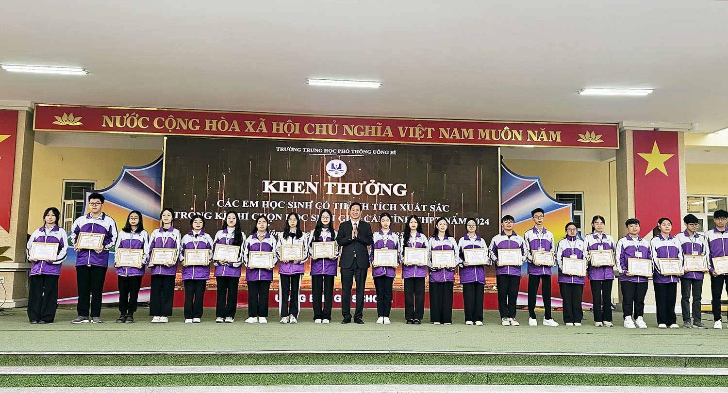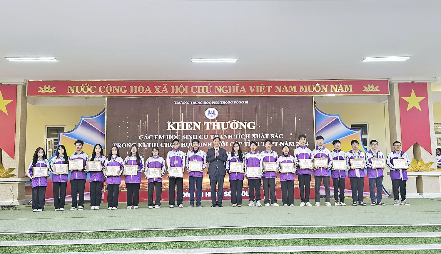 Nhân dịp này, đồng chí Chủ tịch UBND thành phố đã trao tặng giấy khen cho nhà giáo Mạnh Hồng Hải, nguyên Hiệu trưởng Trường THPT Uông Bí vì đã có thành tích tiêu biểu, xuất sắc đóng góp cho công tác giáo dục và đào tạo tại bậc THPT của thành phố Uông Bí trong giai đoạn 2016-2024. Đồng thời, tặng giấy khen cho 45 học sinh của Trường THPT Uông Bí đã đạt giải Nhất, Nhì và Ba trong kỳ thi chọn học sinh giỏi cấp tỉnh năm học 2024-2025.