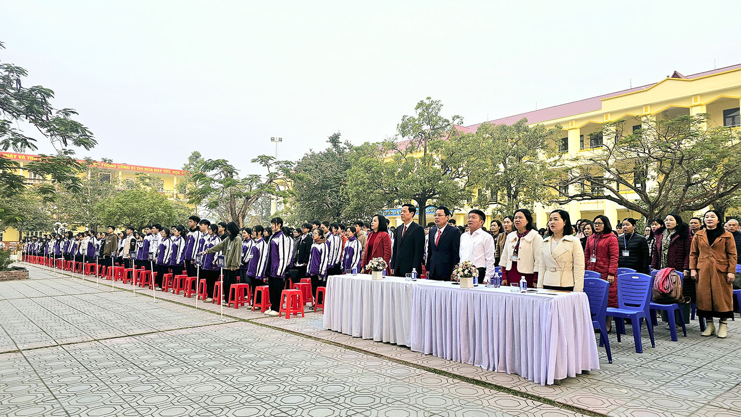 Các đại biểu và giáo viên, học sinh Trường THPT Uông Bí thực hiện nghi lễ chào cờ.