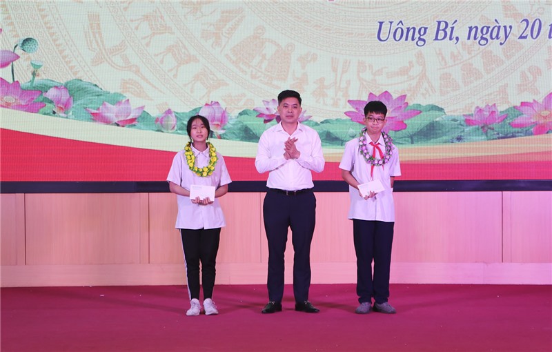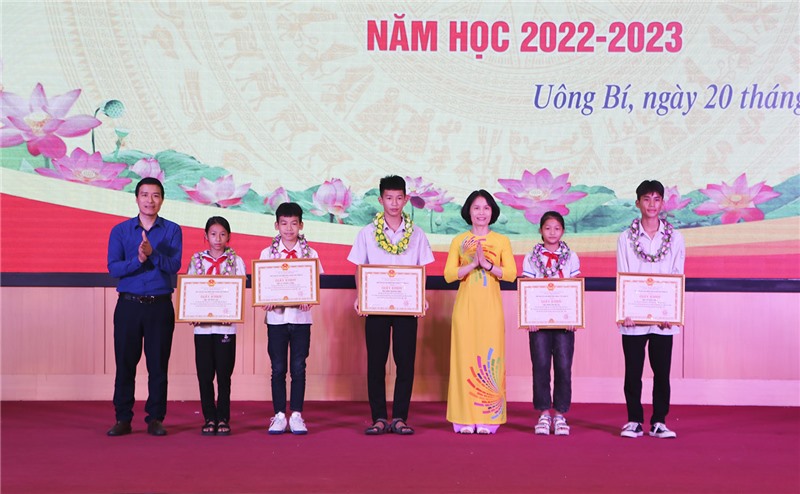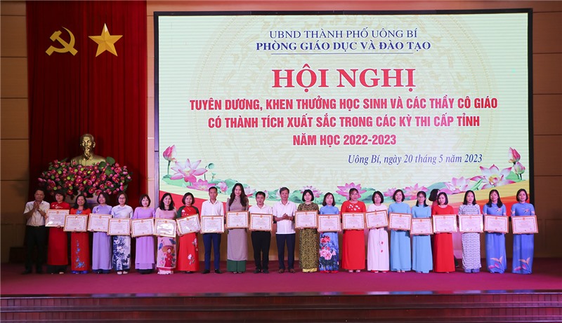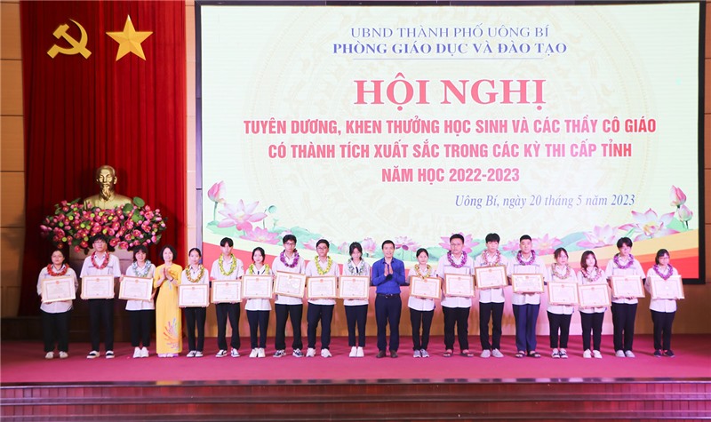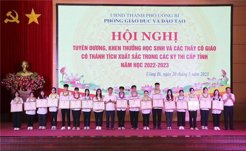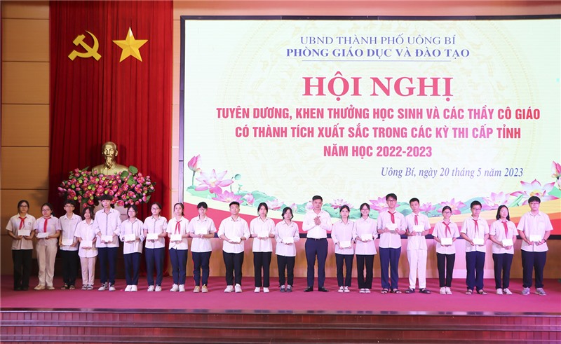 Tại hội nghị, UBND thành phố đã tuyên dương, khen thưởng 67 học sinh, 20 thầy cô giáo có thành tích xuất sắc trong kỳ thi cấp tỉnh năm học 2022-2023. Nhân dịp này, Công ty Bảo hiểm hàng không Quảng Ninh trao 20 suất quà cho các học sinh khối THCS.