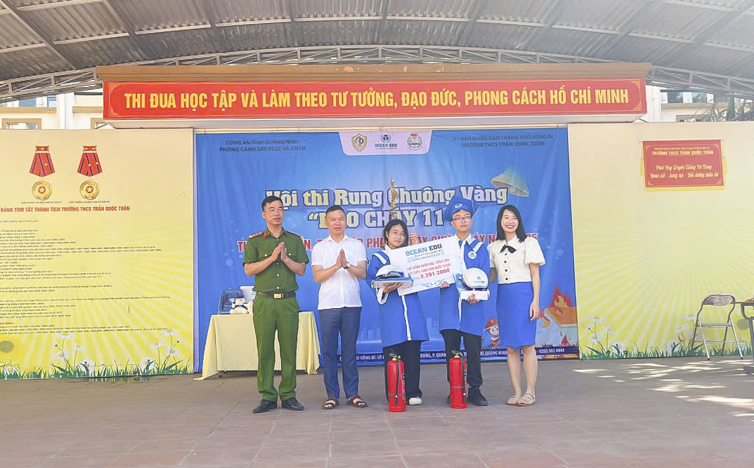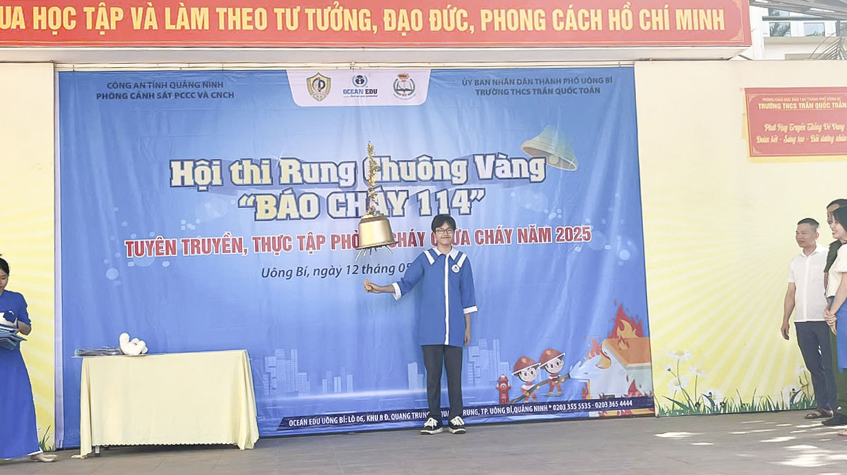 Nhân Tháng Cônsg nhân và Tháng hành động về An toàn, vệ sinh lao động, Tổ công tác Uông Bí Phòng Cảnh sát PCCC và CNCH, Công an tỉnh Quảng Ninh phối hợp với trường THCS Trần Quốc Toản tổ chức buổi tuyên truyền, huấn luyện kỹ năng phòng cháy chữa cháy (PCCC) và Hội thi “Báo cháy 114”.