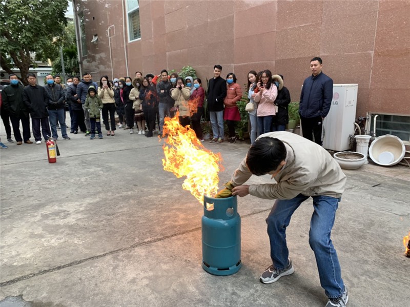Đội viên đội PCCC cơ sở sử dụng bình chữa cháy xách, khăn ướt tay dập tắt đám cháy bình gas.