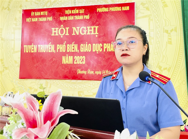 Kiểm sát viên Viện Kiểm sát Nhân dân thành phố tuyên truyền các nội dung tại hội nghị.