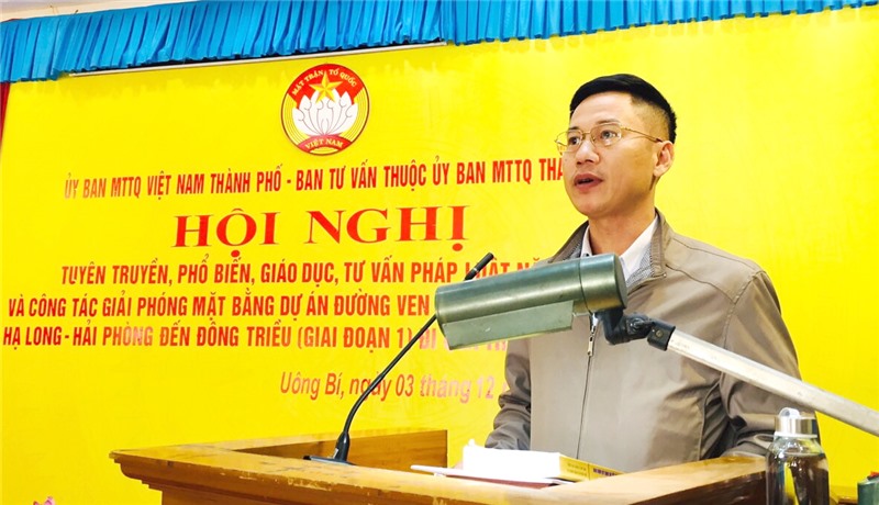 Sáng 3/12, tại phường Yên Thanh, MTTQ TP Uông Bí phối hợp tổ chức hội nghị tuyên truyền, phổ biến, giáo dục, tư vấn pháp luật và công tác GPMB dự án đường Ven sông kết nối từ cao tốc Hạ Long - Hải Phòng đến TX Đông Triều (giai đoạn 1) đi qua địa bàn TP Uông Bí. Tham gia hội nghị có các cán bộ đoàn thể cơ sở và đại diện một số hộ dân liên quan dự án.