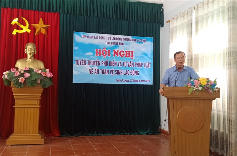 Sáng 7-6, LĐLĐ thành phố Uông Bí phối hợp tổ chức hội nghị tuyên truyền, phổ biến, tư vấn pháp luật an toàn vệ sinh lao động cho gần 90 cán bộ, đoàn viên công đoàn cơ sở trực thuộc. Đồng chí Đỗ Cao Thượng, Phó Chủ tịch LĐLĐ tỉnh Quảng Ninh dự hội nghị.