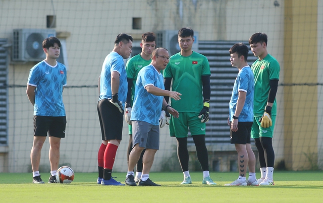 Trong buổi tập chiều, HLV Park Hang Seo đặc biệt dành sự chú ý đến nhóm thủ môn. Ông thầy người Hàn Quốc đã có những dặn dò rất kỹ lưỡng với những Văn Toản, Văn Chuẩn trước khi bắt đầu buổi tập.