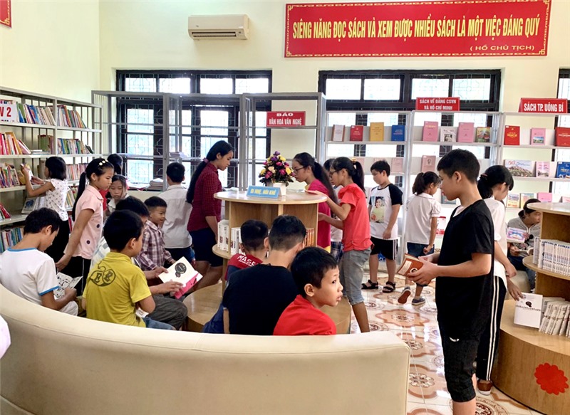 Các em học sinh tham quan Nhà truyền thống, thư viện thành phố.