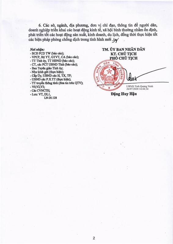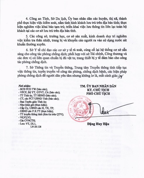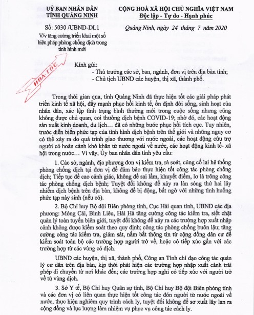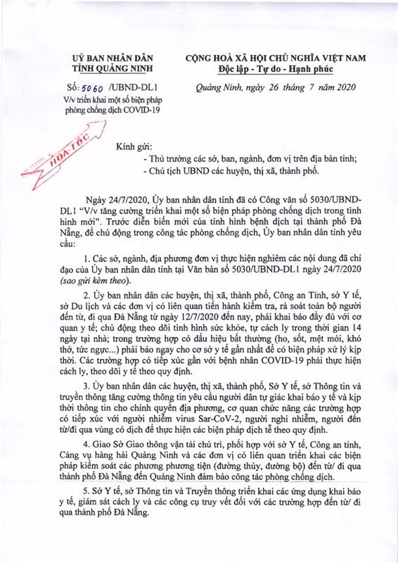 Ngày 26/7, UBND tỉnh ban hành Công văn số 5060/UBND-DL1 về việc triển khai một số biện pháp phòng chống dịch COVID-19. Trước đó, ngày 24/7/2020, UBND tỉnh đã có Công văn số 5030/UBND-DL1 “V/v tăng cường triển khai một số biện pháp phòng chống dịch trong tình hình mới”