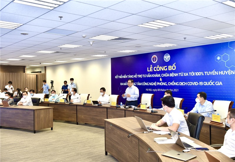 Chiều 8/8, tại Hà Nội, Thủ tướng Phạm Minh Chính dự lễ công bố kết nối Nền tảng hỗ trợ tư vấn khám, chữa bệnh từ xa (Telehealth) tới 100% tuyến huyện và ra mắt Trung tâm công nghệ phòng, chống dịch COVID-19 Quốc gia.