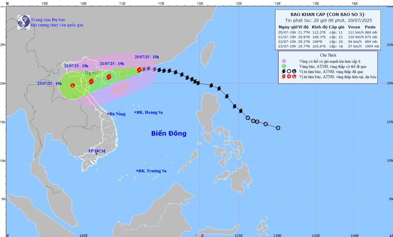Hiện nay, bão số 3 đang hoạt động trên khu vực Bắc Biển Đông, cường độ rất mạnh (cấp 12, giật cấp 15). Đây là cơn bão mạnh, di chuyển nhanh. Theo dự báo của Trung tâm Dự báo Khí tượng thủy văn quốc gia, bão sẽ ảnh hưởng đến Bắc Bộ và Bắc Trung Bộ từ chiều tối ngày 21 tháng 7 năm 2025, gây gió mạnh, mưa lớn, nguy cơ cao xảy ra lũ ống, lũ quét, sạt lở đất ở trung du và miền núi, ngập lụt tại các vùng thấp trũng và đô thị.