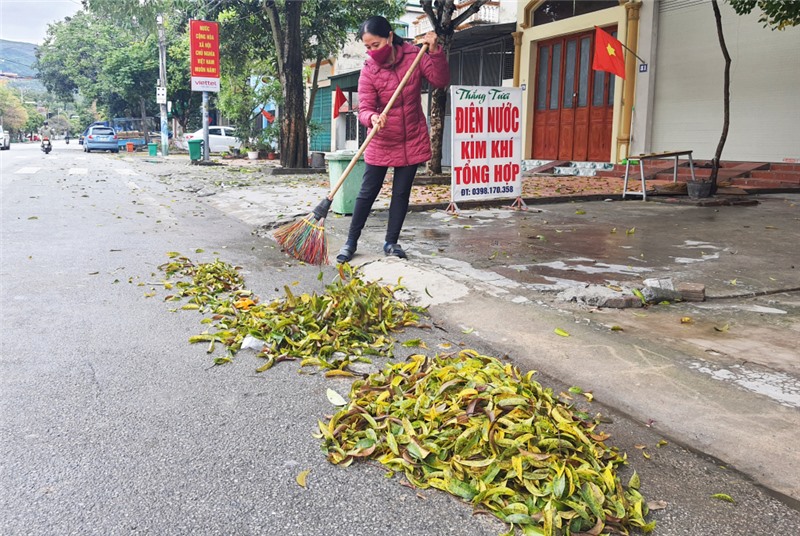 Người dân sử dụng chổi tái chế từ rác thải nhựa để quét rác.