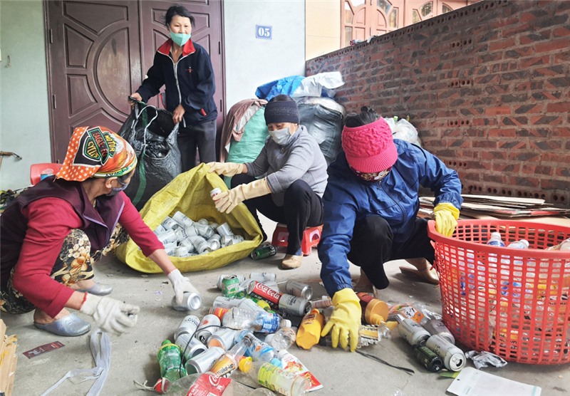 Phụ nữ khu 1, phường Quang Trung (TP Uông Bí) phân loại rác thải nhựa để bán cho các cơ sở thu mua phế liệu.
