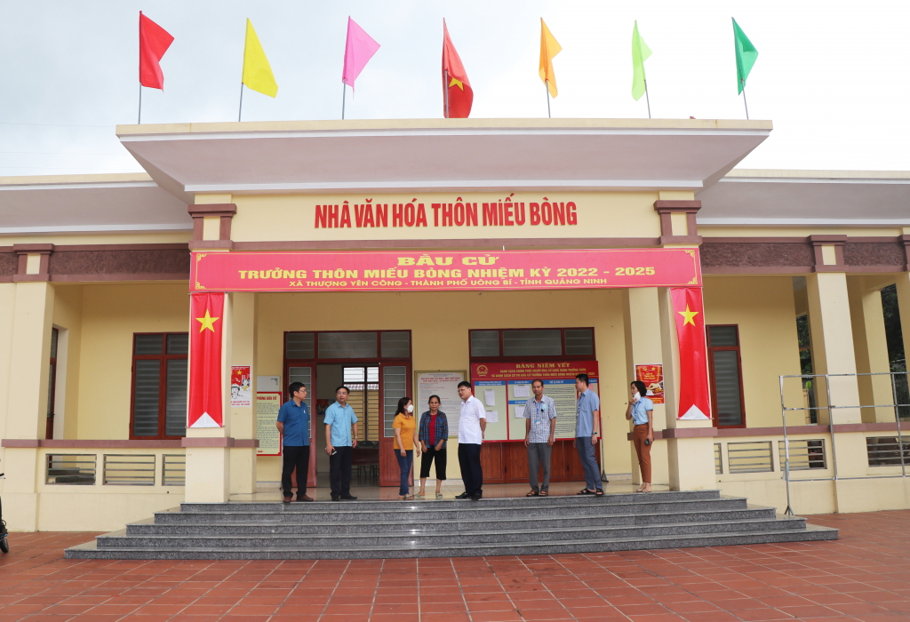 Chủ tịch HĐND TP Uông Bí Nghiêm Xuân Cường (áo trắng, đứng giữa) trao đổi, nắm bắt thông tin với nhân dân thôn Miếu Bòng, xã Thượng Yên Công.