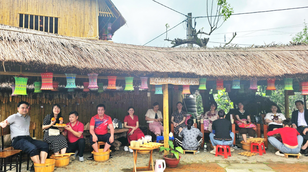Du khách trải nghiệm dịch vụ ngâm chân lá thuốc tại mô hình du lịch cộng đồng người Dao Thanh Y xã Thượng Yên Công.