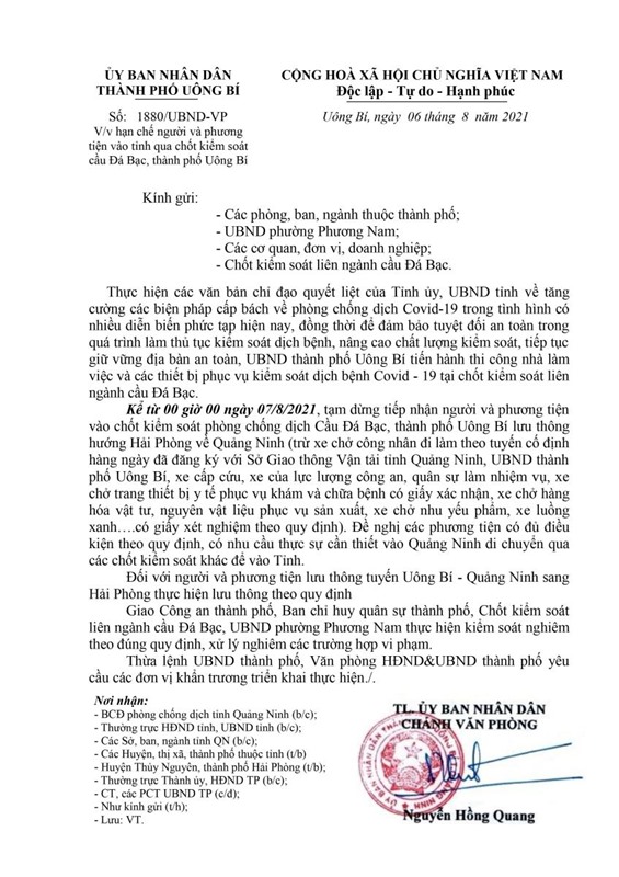 Ngày 6-8, Ủy ban nhân dân thành phố ban hành văn bản số 1880/UBND-VP về việc hạn chế người và phương tiện vào tỉnh qua chốt kiểm soát cầu Đá Bạc, thành phố Uông Bí.