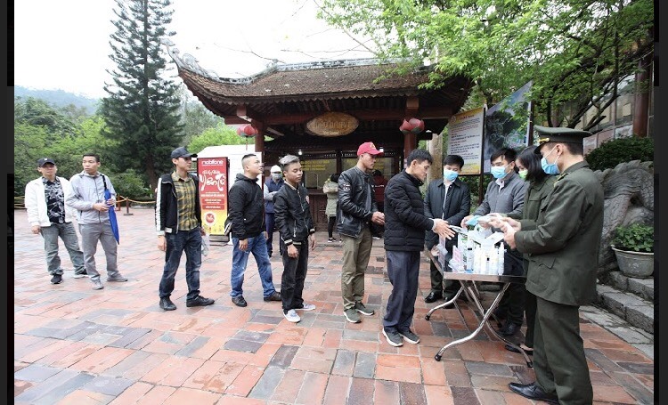 Phát khẩu trang miễn phí, xịt dung dịch rửa tay cho du khách tại Yên Tử.