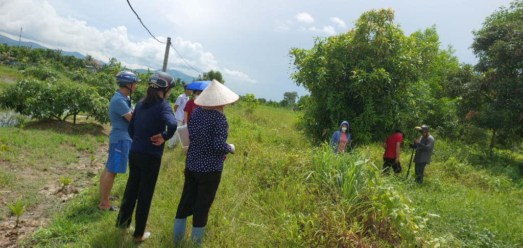 Cán bộ địa chính phường Phương Đông đo thực địa ranh giới cho các hộ dân liên quan giải quyết kiến nghị xây dựng chồng lấn.