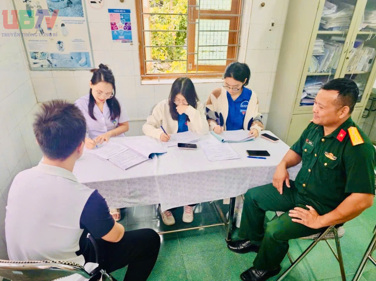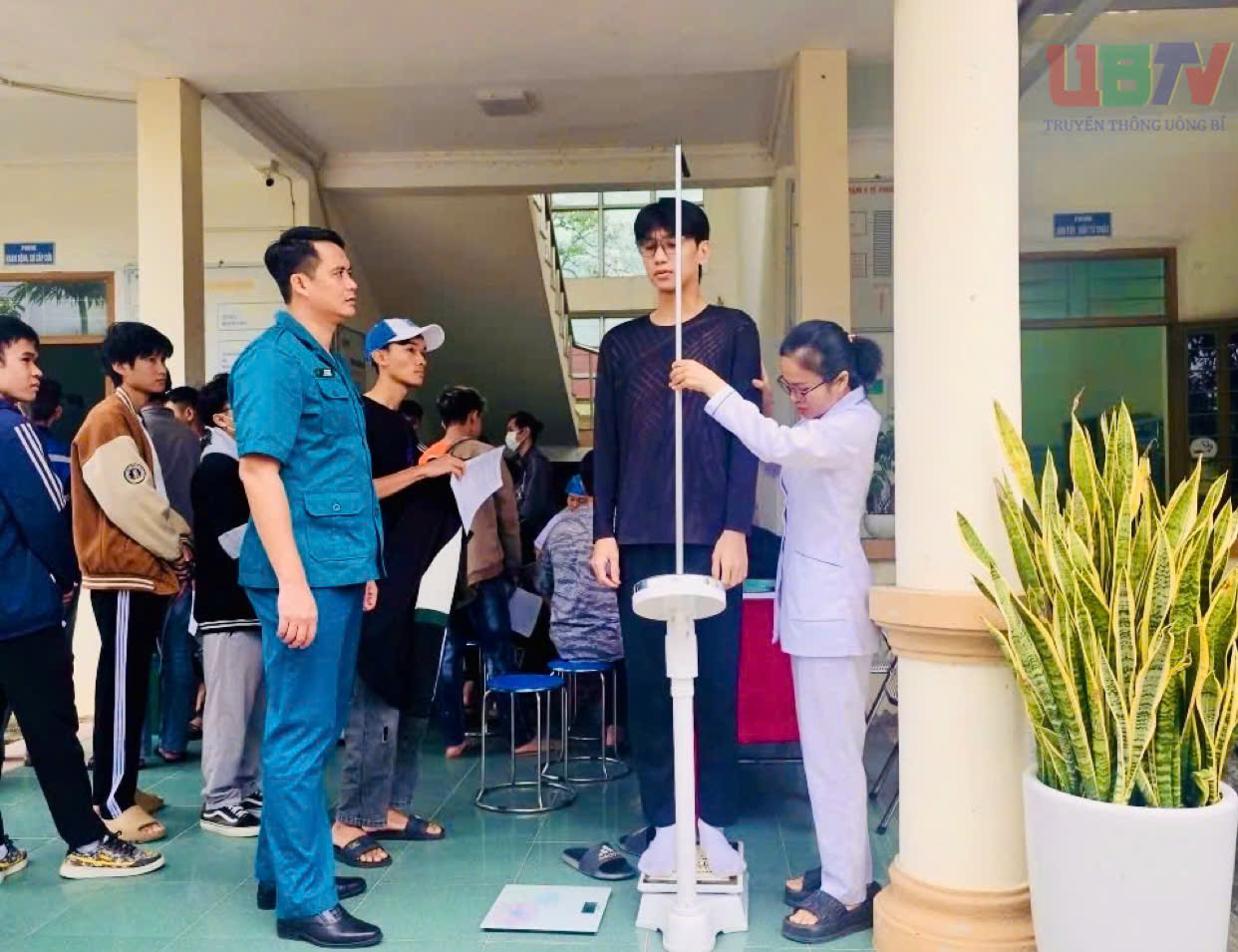 Cán bộ y tế phường kiểm tra chiều cao, cân nặng cho thanh niên trong diện sơ tuyển.