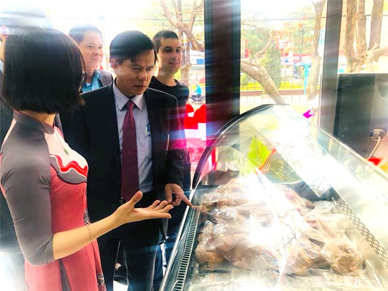 Các đại biểu cắt băng khai trương gian hàng đặc sản gà ri vàng rơm.