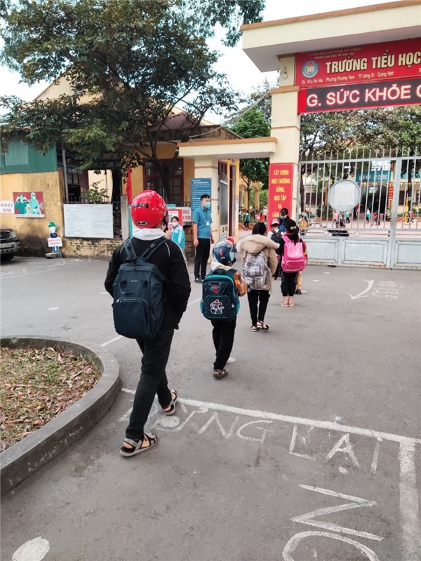 Học sinh Trường Tiểu học Phương Nam A đến trường được hướng dẫn đảm bảo khoảng cách an toàn phòng chống dịch.