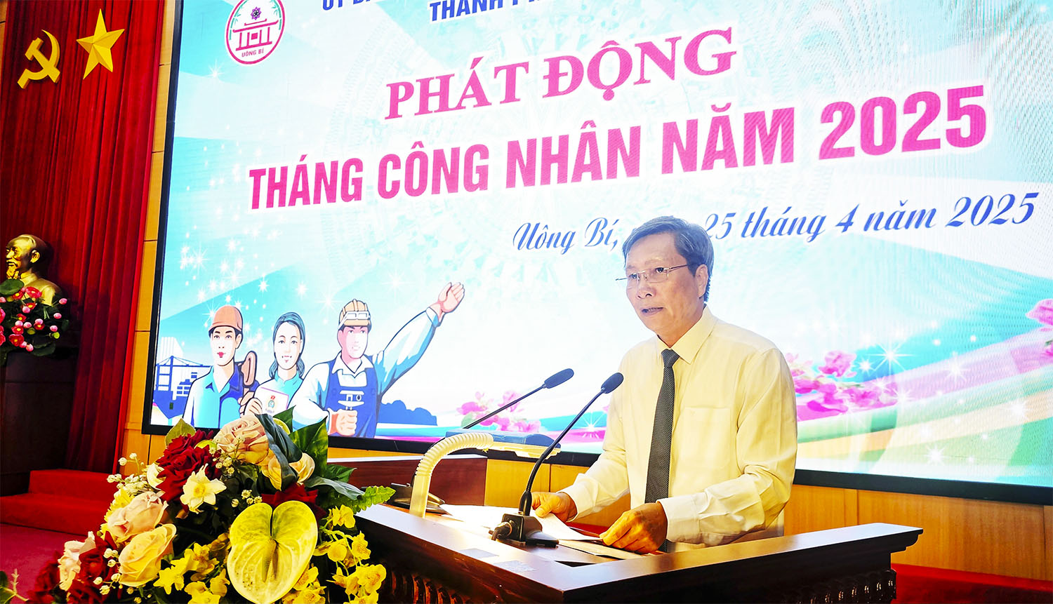 Đồng chí Nguyễn Văn Thành, Ủy viên Ban Thường vụ Thành ủy, Phó Chủ tịch Thường trực UBND thành phố Uông Bí phát biểu phát động Tháng Công nhân năm 2025.