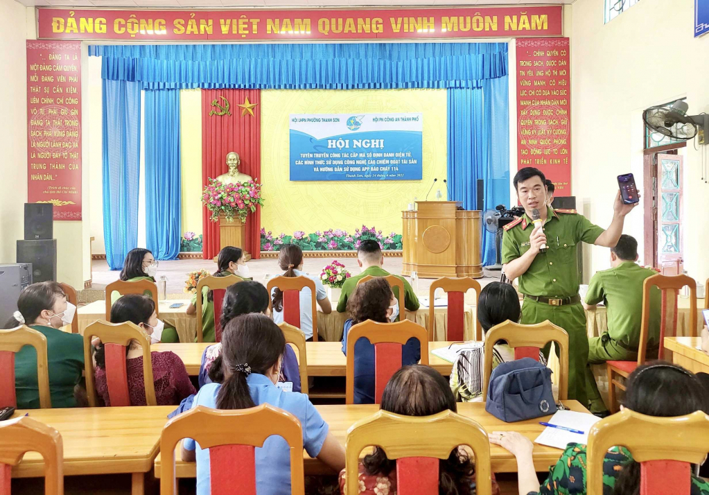 Hội LHPN phường Thanh Sơn (TP Uông Bí) phối hợp với Hội Phụ nữ Công an thành phố tuyên truyền việc cấp tài khoản định danh điện tử, phòng chống tội phạm trên địa bàn. (Ảnh: Trung tâm TT-VH Uông Bí)