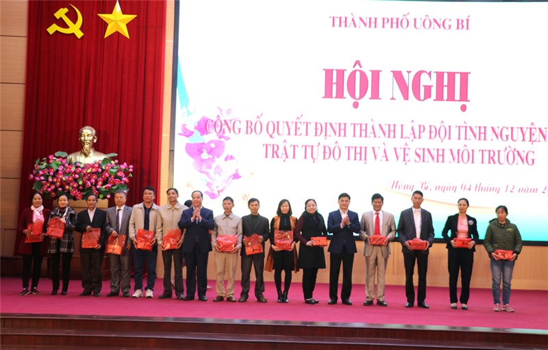 Sáng 4-12, TP Uông Bí tổ chức hội nghị công bố quyết định thành lập Đội tình nguyện viên trật tự đô thị, vệ sinh môi trường. Tới dự có các đồng chí: Nguyễn Mạnh Hà, Phó Bí thư Thành ủy, Chủ tịch UBND thành phố; Đỗ Trường Sơn, UVBTV Thành ủy, Phó Chủ tịch Thường trực HĐND thành phố; Bùi Văn Thành, Phó Chủ tịch UBND thành phố.