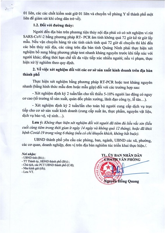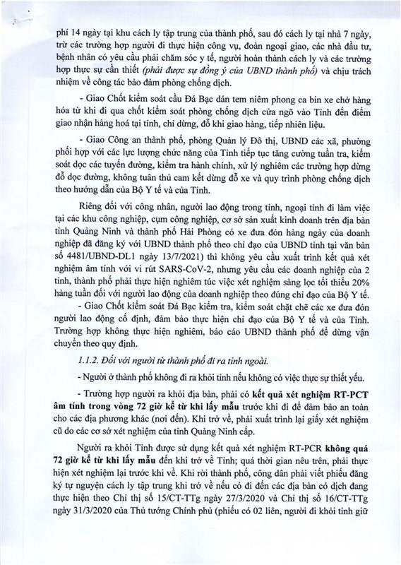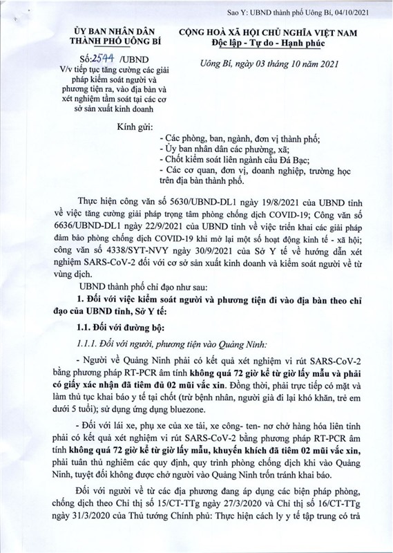 Ngày 3-10, Ủy ban nhân dân thành phố ban hành văn bản số 2544/UBND về việc tiếp tục tăng cường các giải pháp kiểm soát người và phương tiện ra, vào địa bàn và xét nghiệm tầm soát tại các cơ sở sản xuất kinh doanh.