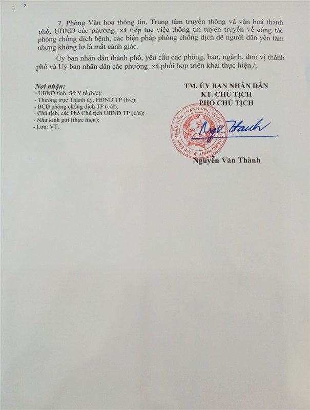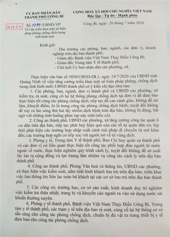 Công văn số 1794/UBND -VP ngày 26/7/2020 của Ủy ban nhân dân thành phố Uông Bí: V/v triển khai một số biện pháp phòng chống dịch trong tình hình mới