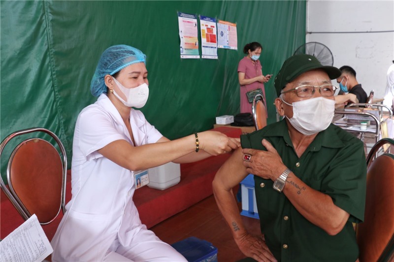 Cán bộ y tế tiêm vắc xin phòng Covid-19 đợt 8 mũi 2 cho các trường hợp.